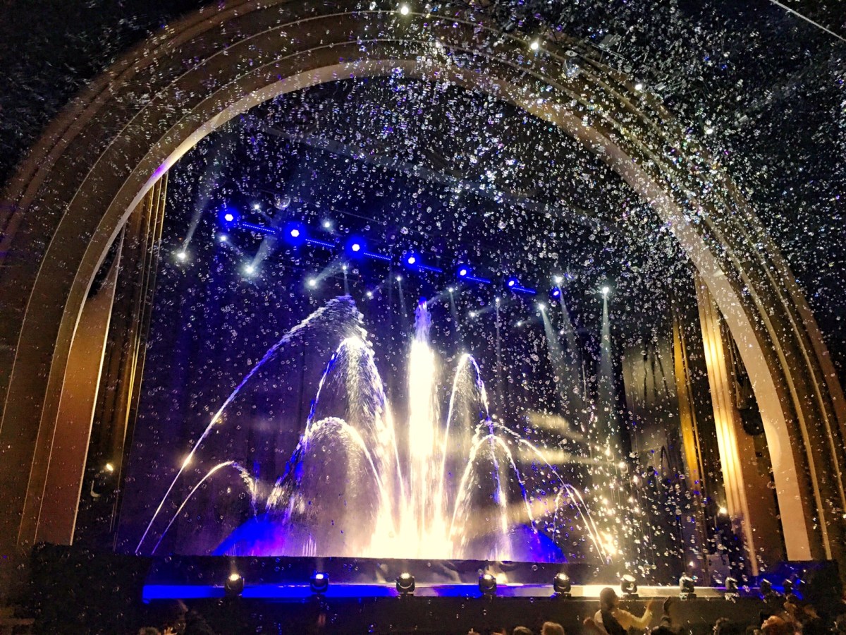 Quand la lumière s’éteint, l’arcade de la scène s’illumine de couleurs vives. Bientôt, la Féérie des eaux commence. Les jeux de lumières et de fontaines jaillissent de tous côtés. Des squelettes lumineux dansent sur les murs. Les mains se tendent pour attraper les milliers de bulles propulsées dans la salle et les serpentins qui tombent du plafond.