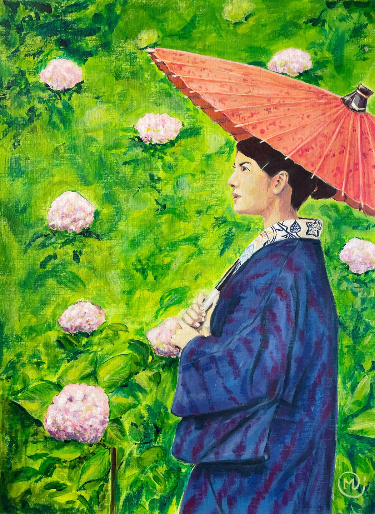 Pendant ce travail, j’écoutais 1Q84 de Haruki Murakami. Le livre 1. Là encore, le rythme de l’histoire est assez lent. Les personnages prennent leur temps, leurs émotions ne nichent dans l’entrelacs élastique des mots. Un tempo idéal pour peindre une Japonaise en kimono devant un mur d’hortensias.