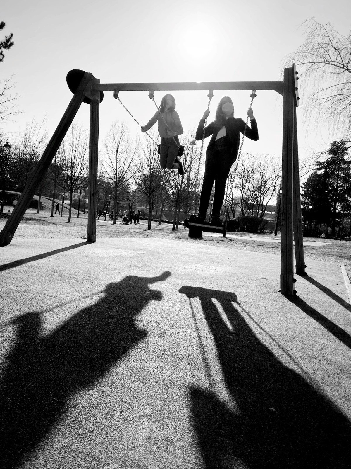 Leurs ombres vont et viennent sur le sol alors que leurs rires résonnent sur le ciel limpide.