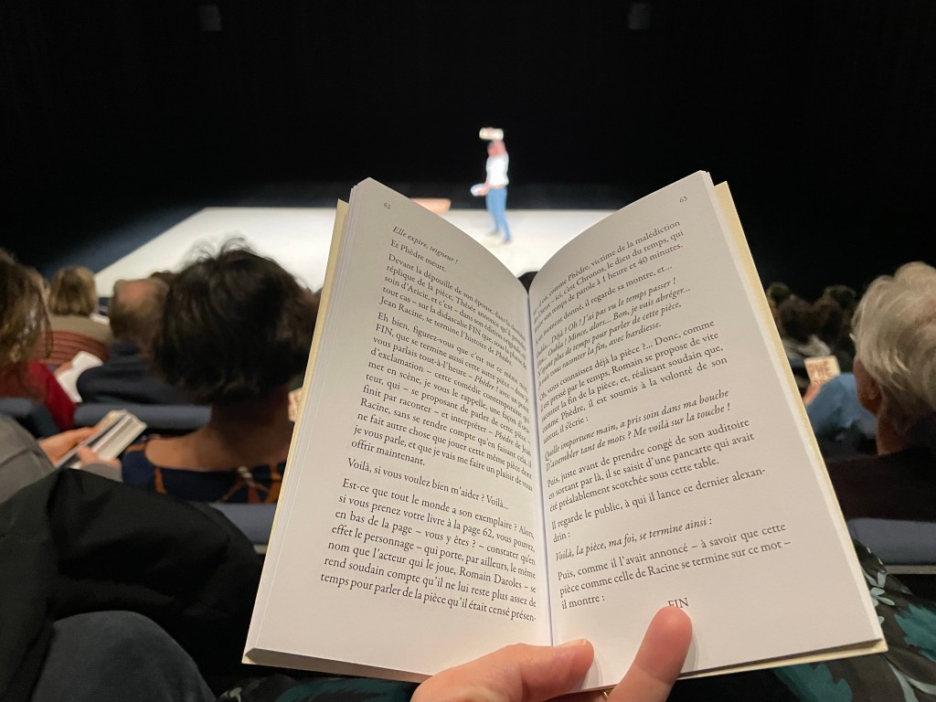 Son seul accessoire ? Le livre de la pièce. Celle de Gremaud, pas celle de Racine. Le petit ouvrage de couleur crème, où le titre se détache en grosses lettres rouges, sert de houppette pour Hippolyte, de couronne pour Phèdre et de barbe pour Théramène, tout en simulant la toge de Thésée sur son épaule.