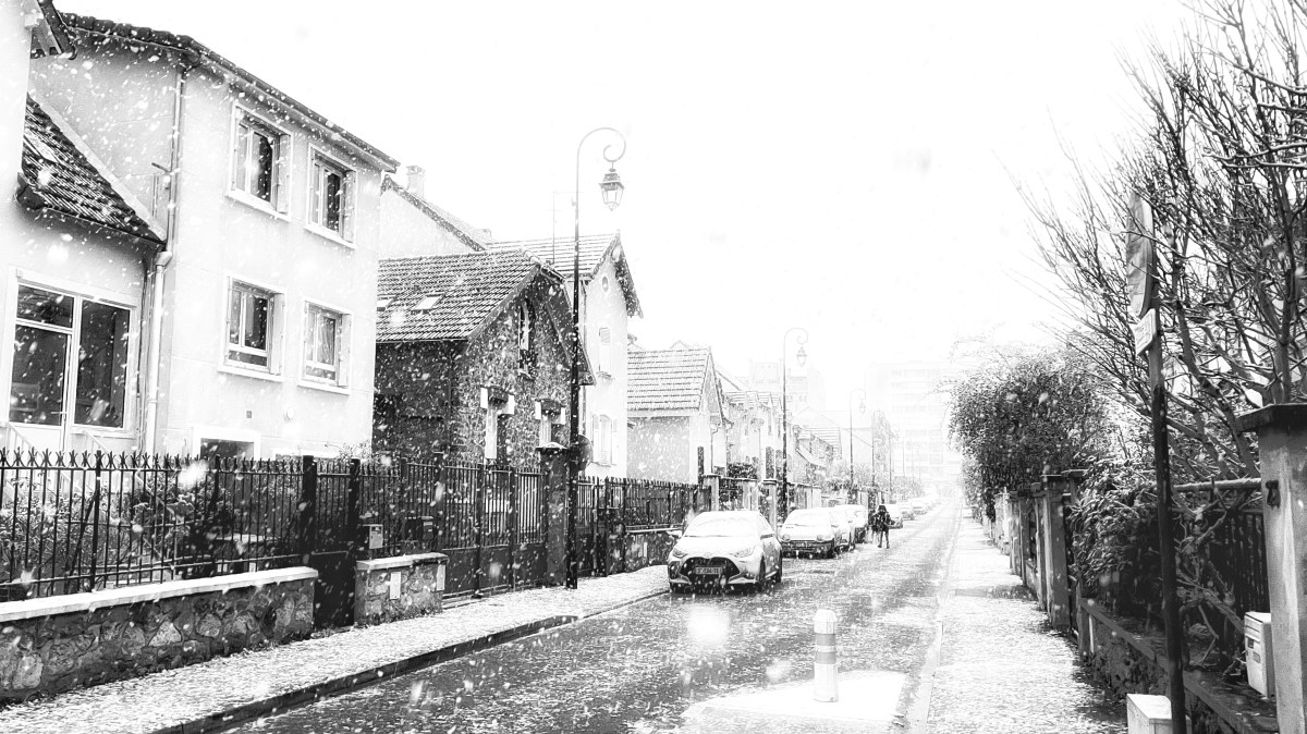 Jour de grève. Jeudi noir. La radio diffuse une playlist bienveillante. Les piétons sont emmitouflés dans leurs doudounes. Les visages disparaissent sous les bonnets et derrière les écharpes. Les premières batailles de boules de neige éclatent à la sortie du collège et du lycée.