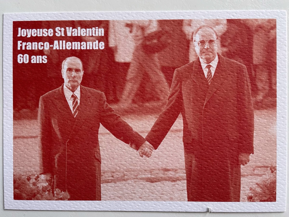Mon imprimeur a beaucoup d’humour. Plutôt que de multiplier les cœurs dans sa vitrine à l’occasion de la Saint-Valentin, il a mis à disposition des cartes postales à l’énergie du couple franco-allemand. Ainsi, j’ai trouvé à la caisse du Sac de Graines, un magasin de vrac juste en face de L’Imprimoir, une carte postale de François Mitterrand et Helmut Kohl se tenant par la main ; et une autre de Jacques Chirac et Gerhard Schröder se serrant dans les bras. Peut-être en ai-je raté une autre de Charles de Gaulle et Konrad Adenauer s’élançant l’un vers l’autre en 1963 pour la signature du Traité de l’Elysée.