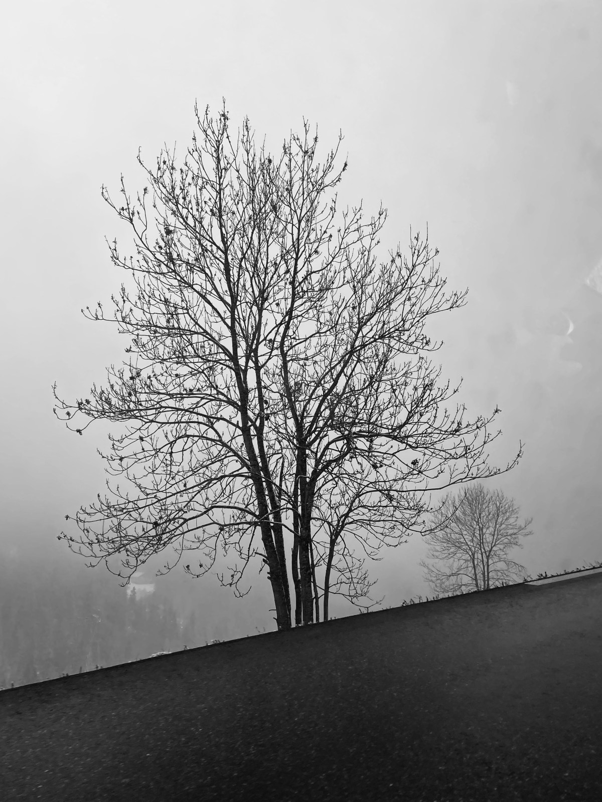 Depuis la fenêtre arrière de la voiture, taraudée par le mal des transports, je suis des yeux les têtes dénudées des arbres qui peu à peu blanchissent. La montagne se fait Parnasse où les muses s’amusent à créer de la poésie dans les fondus de grisaille.