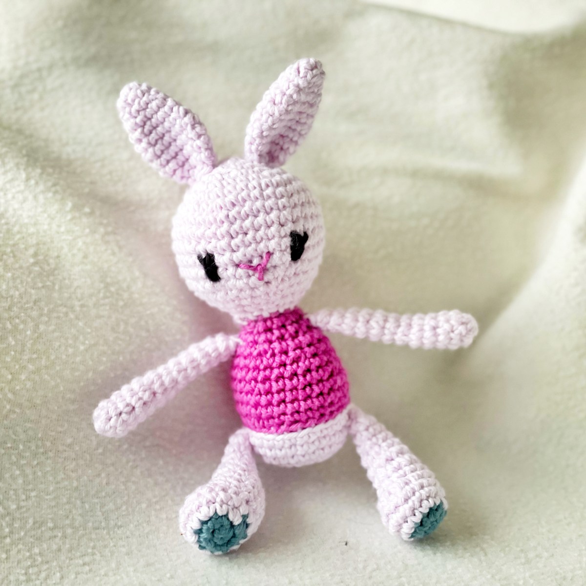 Le crochet a tournoyé dès ce matin. Il ne restait plus qu’un bras crochète et un peu de couture pour assembler tous les membres. Le lapin est terminé.