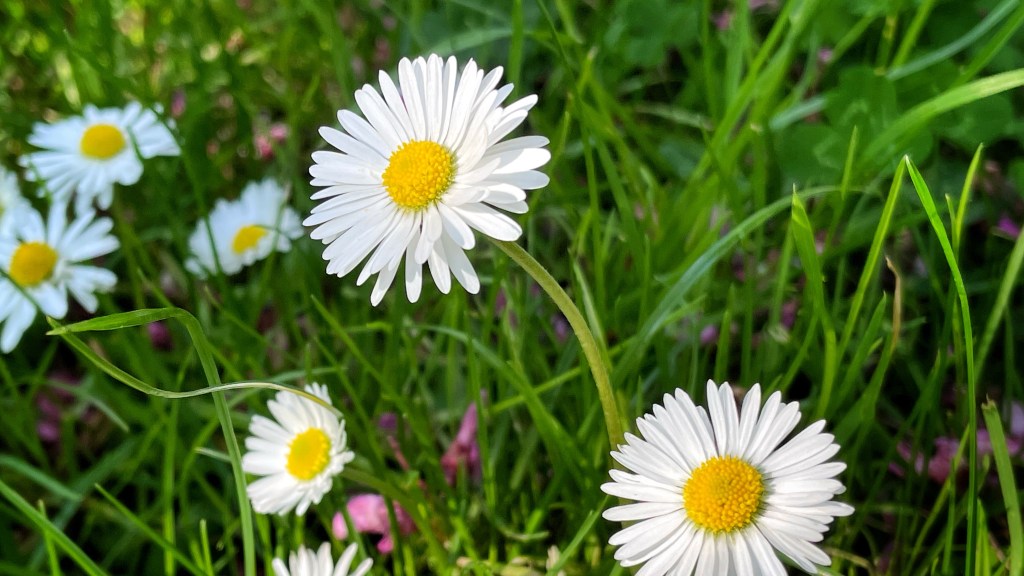 Pâquerettes et herbes fraîches dans un rayon de soleil : cliché feel-good de mon jardin