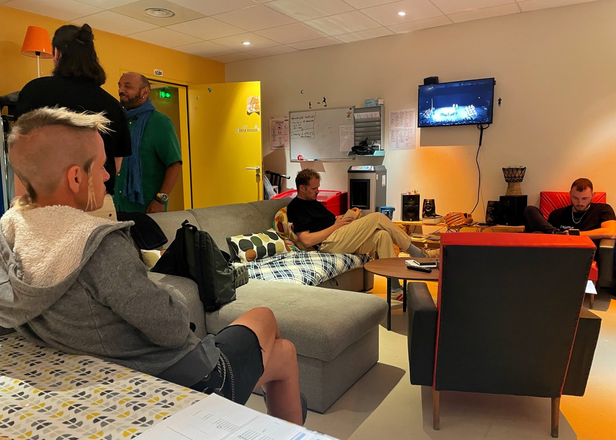 Jour d’orage. Les spectacles sont rapatriés à l’intérieur du théâtre. Dans le foyer, musiciens et techniciens regardent le dernier spectacle grâce au retour vidéo. Au fond, à gauche, je reconnais Eglantine, trop heureuse de jouer avec une poutre dans la lumière des spots.