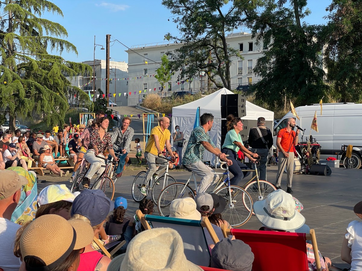 Les artiste font tournoyer leurs vélos, les tirent tels des boulets, pédalent le nez au vent telle Paulette sur les chemins environnants, se rentrent dedans, se cherchent, s’évitent puis se retrouvent.