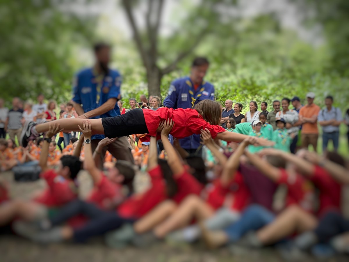 Au week-end de rentrée, les anciens de chaque unité accueillent les nouveaux avec un rite de passage. Cette année, les anciens Rouges étaient assis les uns derrière les autres. Les nouveaux Pionniers et les nouvelles Caravelles se jetaient sur leurs compagnons, portés par une vague de bras levés jusqu’à la fin de la file.