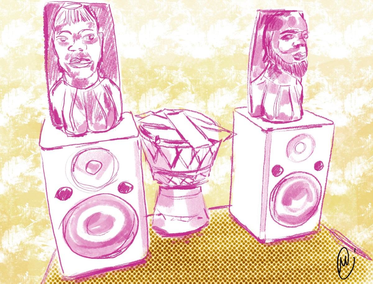 Alors que je reviens après deux mois d’absence, le dernier meuble en bois de palette a disparu du foyer des techniciens. Désormais, les enceintes sont posées sur un meuble télé en métal et verre. Un truc froid et sans âme. Dommmage. Heureusement, il reste les livres posés sur les étagères du bas. Un guide de la Bretagne. Quelques livrets de Phèdre !, deux programmes de la saison passée, des sous-bocks en carton, des flyers, des marques-pages, des câbles de toute sorte et des serres livres en bois sombre, deux visages sculptés d’inspiration africaine. Et un petit ambour récupéré un jour par un technicien, abandonné sur un trottoir.