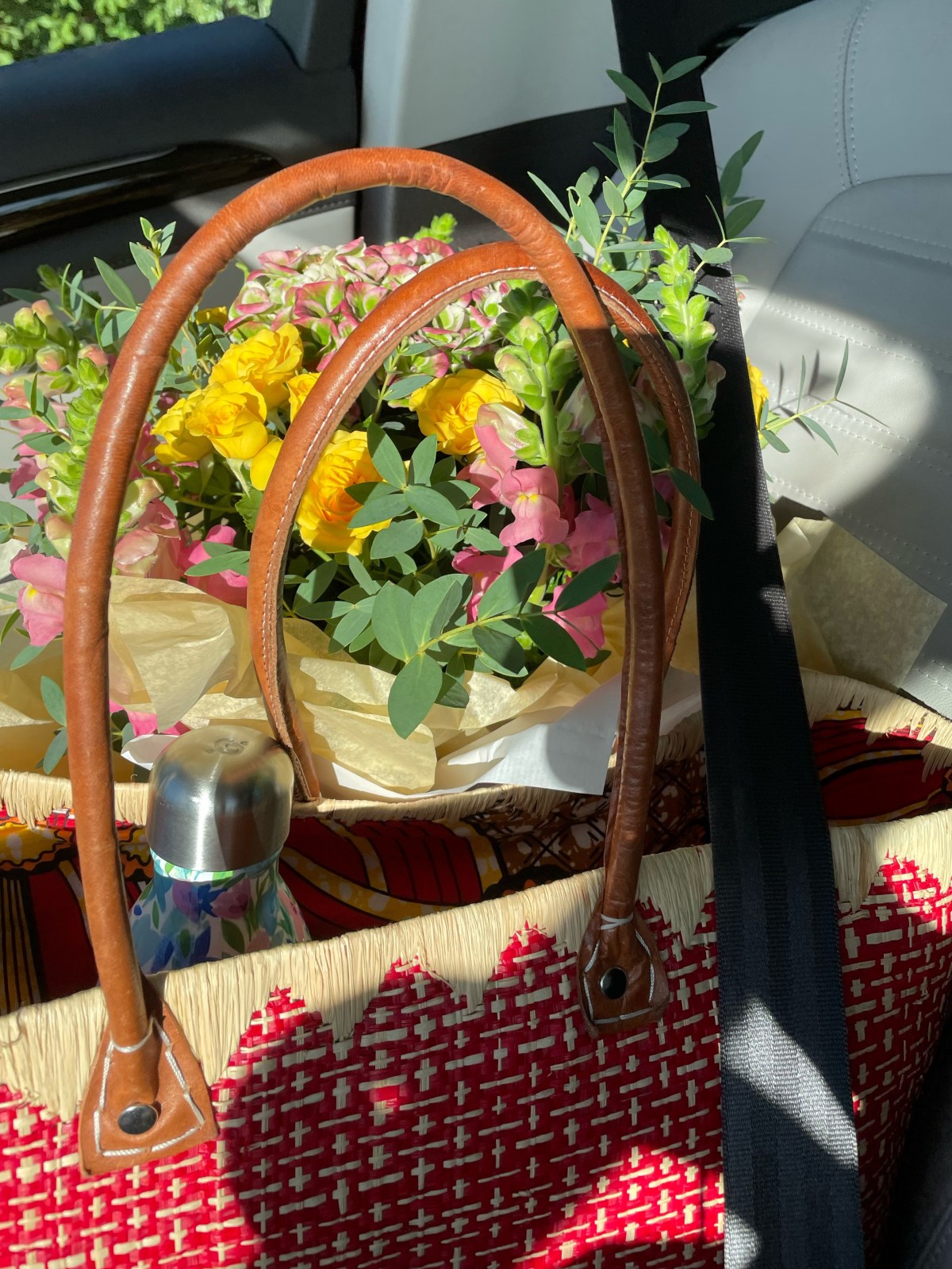 Pour me tenir compagnie dans la voiture, un énorme bouquet de fleur et le panier de mon pique-nique. Des couleurs, de la joie, de la lumière pour m’accompagner et garder le cap dans la tempête.