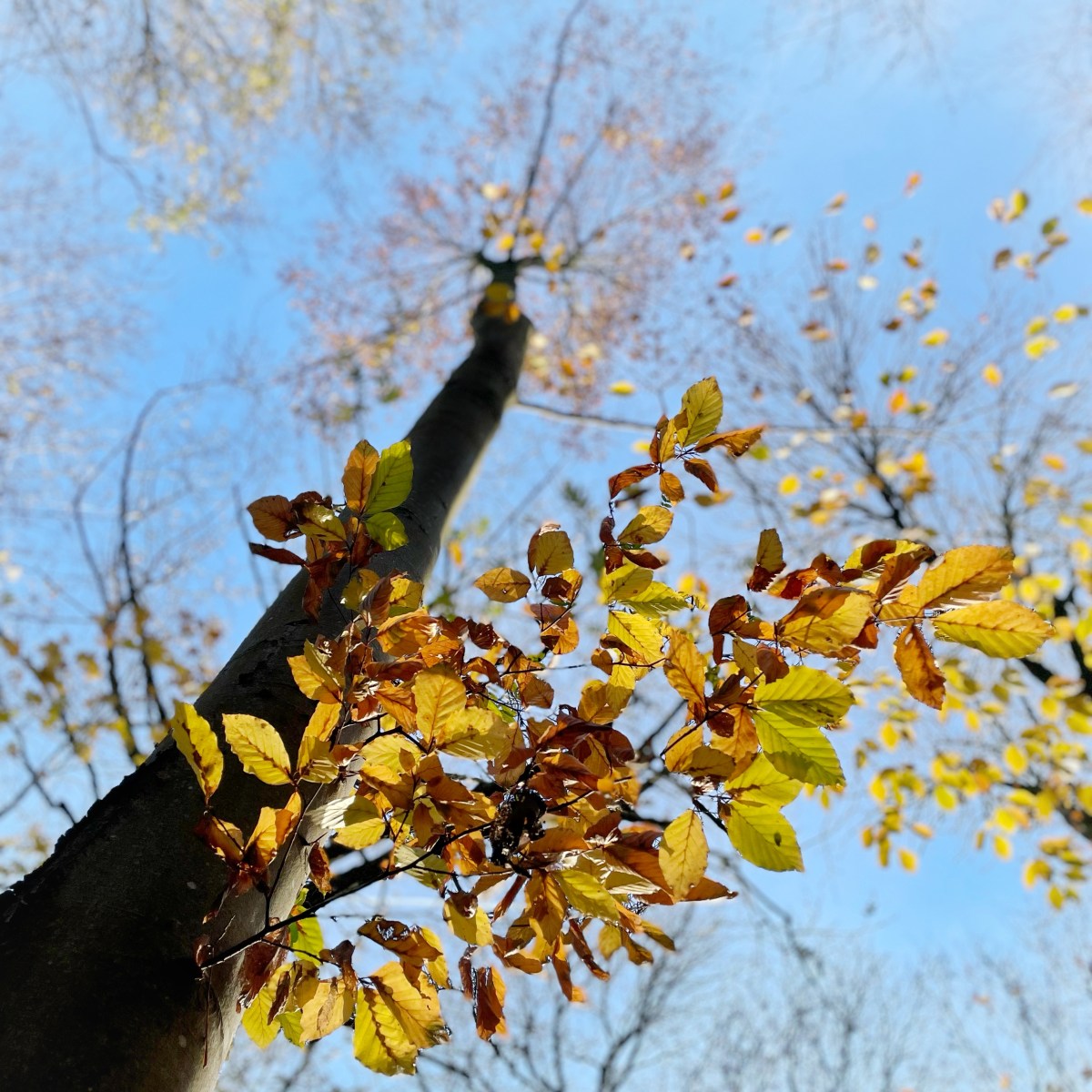 Dans les arbres dénudés par les vents et les pluies des dernières semaines, on trouve encore quelques feuilles capturant le soleil. Malgré la morsure du froid, des éclats lumineux éblouissent le paysage, rehaussant les écorces sombres et la terre humide.