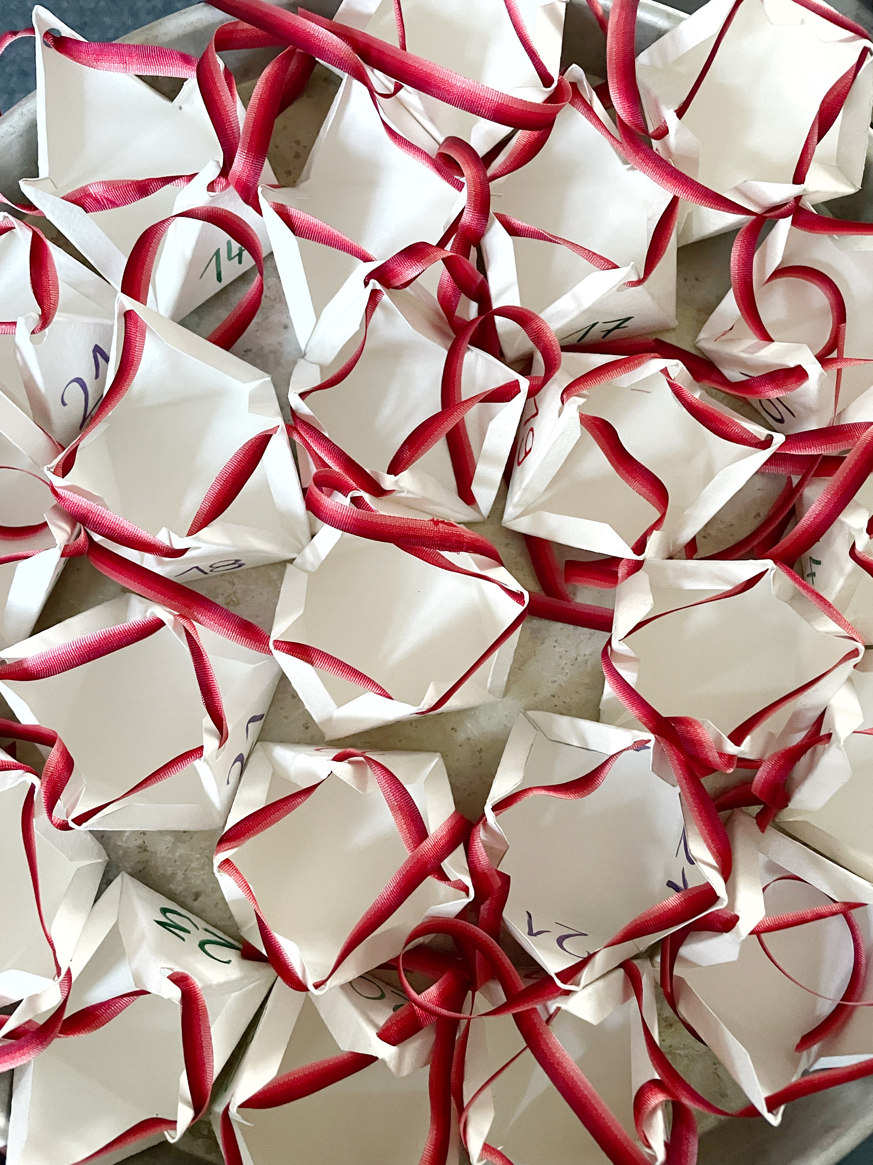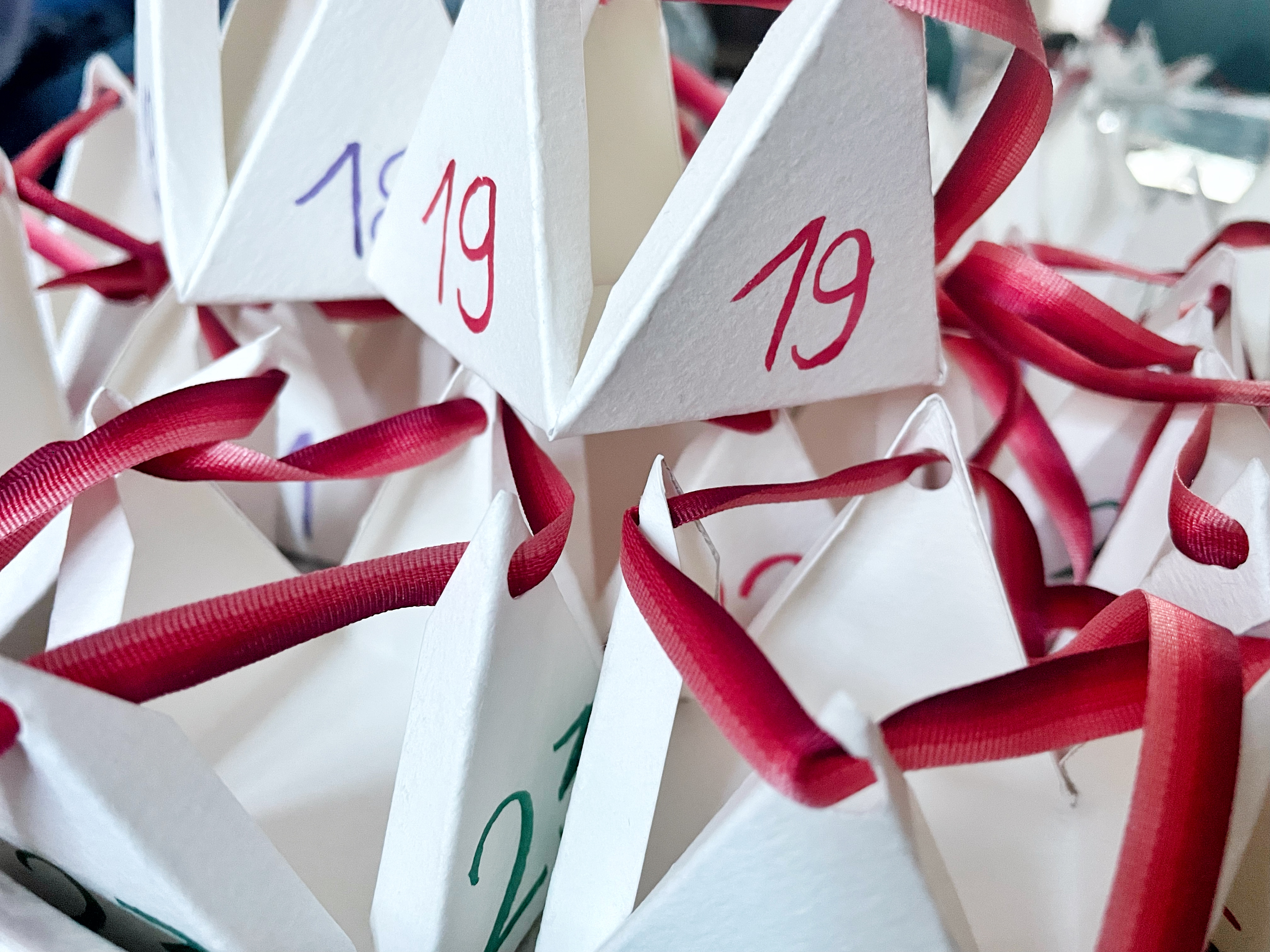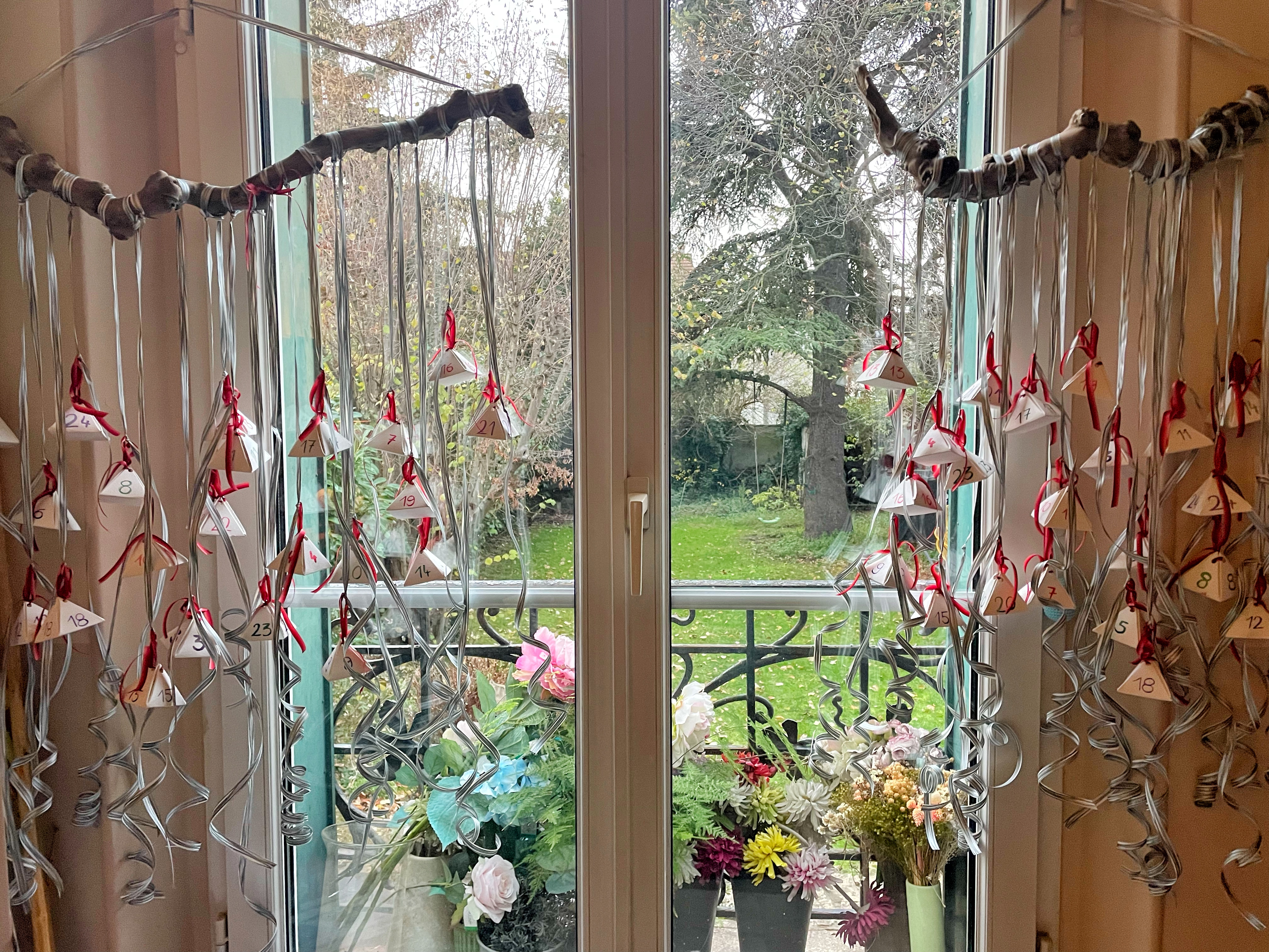 Comme je ne souhaitais pas entreposer les contenants jusqu’à l’année prochaine, j’ai opté pour une version en papier, branche d’arbre et rubans. J’avais tout à la maison. Les rubans datent de l’époque des bazars turc dont je revenais toujours avec trop de choses. J’ai ramassé les branches dans le parc de sceaux il y a quelques années, amoureuse de leurs nœuds tortueux. J’ai fabriqué les boîtes dans du papier aquarelle épais sur lequel il était aisé, ensuite, de tracer les chiffres en rouge, vert et violet. J’ai découpé chaque boîte à la main à partir du modèle trouvé sur le site Tête à modeler. 48 boîtes, 192 trous, 96 boucles de nœud.