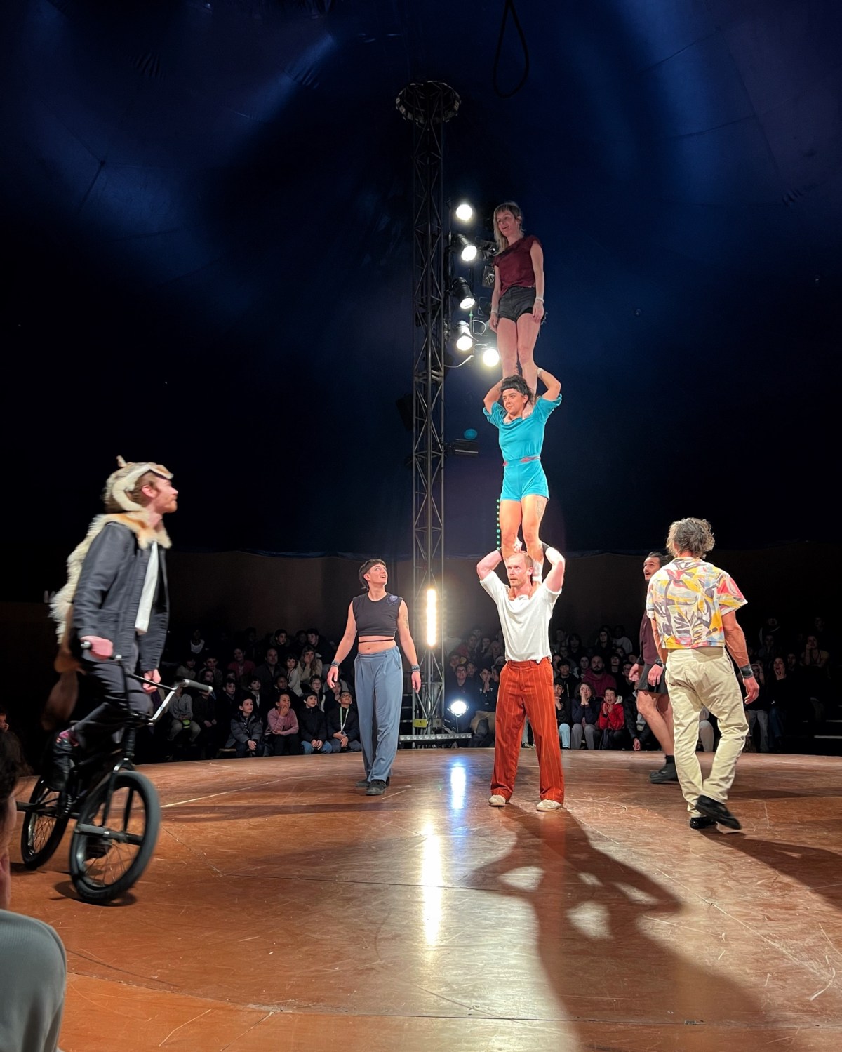 Au premiers hurlements de coyotes, les enfants entrent dans le jeu. Leurs cris répondent à la meute des artistes, mimétisme atavique d’une humanité avide de reproduire, de créer, d’imaginer. Chaque prouesse est accueillie par des exclamations fracassantes. Leurs mains accompagnent le rythme de la musique. Leurs onomatopées forment un chant saccadé qui suit la cadence. Ils sont bruyants. Ils sont joyeux. Ils sont vivants. En osmose avec le spectacle qu’ils sont venus voir. Ils se fondent dans la performance, laissant tomber les filtres des apparences.