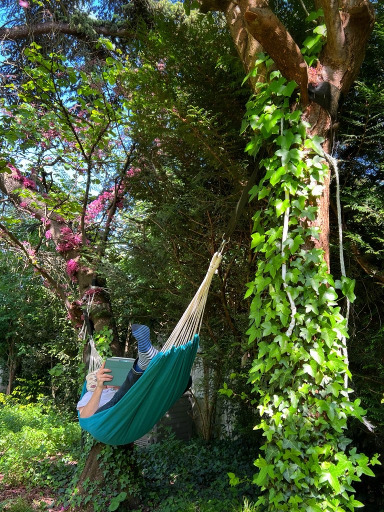 Barbecue. Déjeuner au soleil. Se balancer dans les hamacs sous une pluie de pétales. L’arbre de Judée quitte sa robe de fleurs. Son rose vif s’estompe dans des pastels mats clairsemés de feuilles. Le vent divague dans les feuillages. Les ombres dansent sur l’indolence des chats. Un rouge-gorge virevolte dans un noisetier. Le chien s’étire dans la pelouse flétrie par la chaleur soudaine. Le muguet a fleuri sous l’églantier.