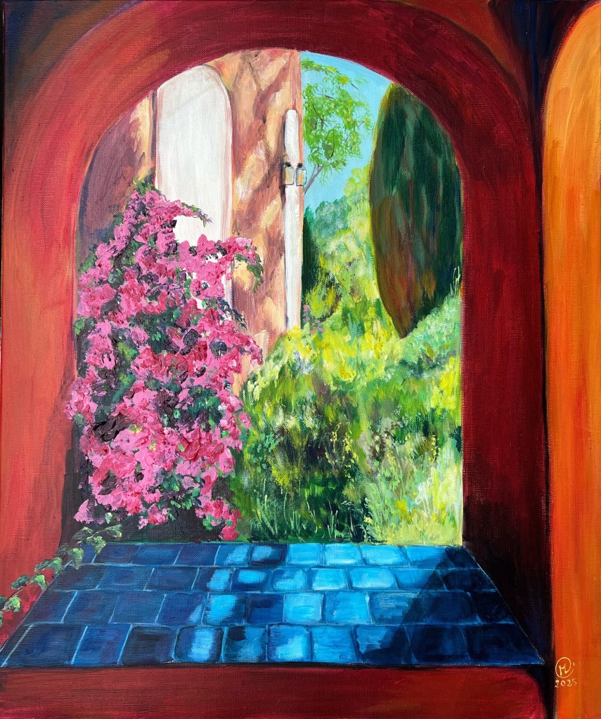 Faire naître sous mes pinceaux une porte ouverte vers l’été alors que la pluie crépite sur la fenêtre.