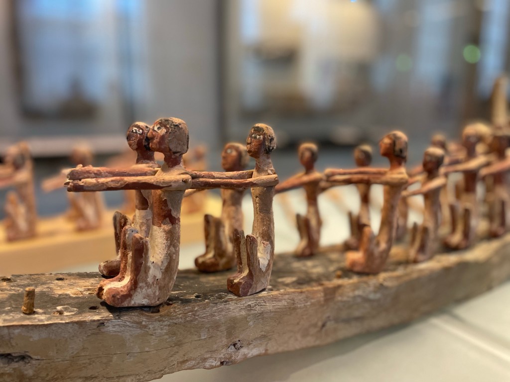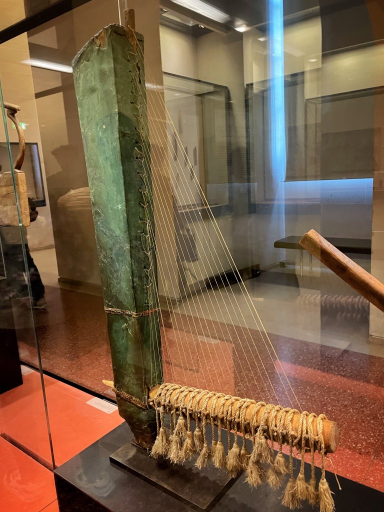 Loin des incontournables du musée, je découvre avec émerveillement les harpes égyptiennes. Belles formes en trapèze, j’aimerais entendre cette musique qui ravit les dieux et les hommes de l’Egypte antique.