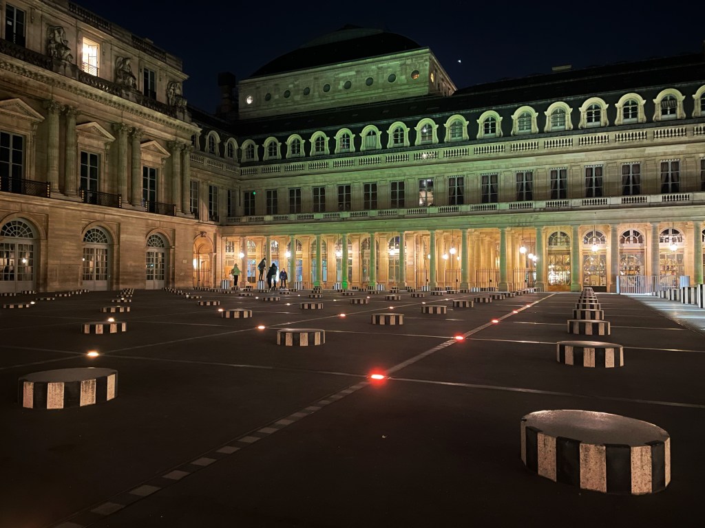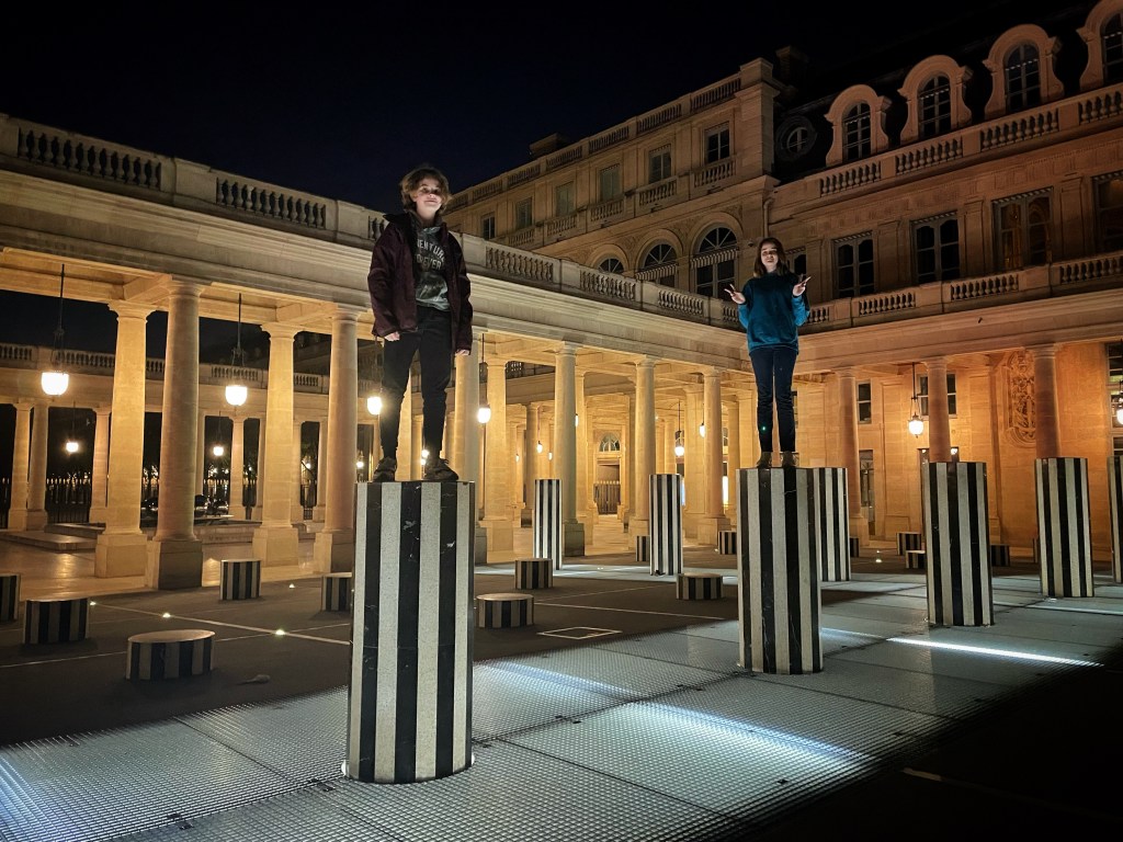 Nous quittons le Louvre à l’heure un peu avant la fermeture des portes. Hortense emmène son amie jouer au milieu des colonnes de Buren. L’heure tardive a chassé les badauds. Nous sommes presque seules. Les filles grimpent de colonne en colonne. La nuit est douce. Un drapeau français flotte sur le bâtiment du Conseil d’Etat.