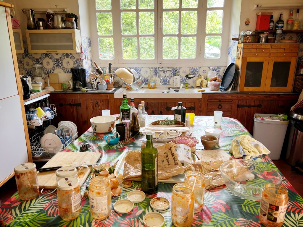 A l’extérieur, végétation luxuriante, piscine et terrain de volley. A l’intérieur les restes du déjeuner côtoient les derniers petits-déjeuners sur la toile cirée de la cuisine. Des vêtements abandonnés constellent les fauteuils du grand salon. Shorts et maillot de bain, sweats à capuche et tee-shirts, le pratique et le confortable siéent au relâchement des corps et des esprits.