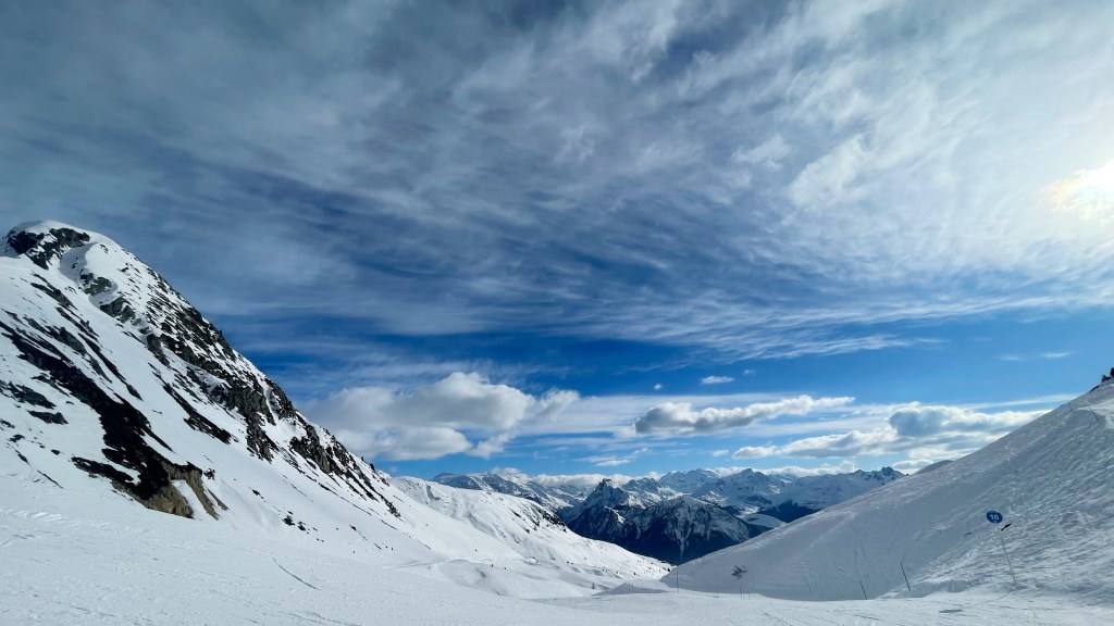 La partie vraiment agréable de cette randonnée devait être la descente à travers un petit vallon loin des skieurs. Malheureusement, la jeune femme en question avait trop peur de tomber. Elle ne pouvait pas non plus s’appuyer sur un de ses bâtons à cause de son épaule blessée. La descente s’annonçait longue. Le guide a modifié ses plans. Et nous sommes redescendues au milieu des pistes, à nouveau, terminant de rejoindre la station de départ en télécabines. Grosse déception.
